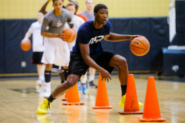 Players advance the ball by bouncing it while walking or running (dribbling) or by passing it to a teammate, both of which require considerable skill. On offense, players may use a variety of shots—the lay-up, the jump shot, or a dunk; on defense, they may steal the ball from a dribbler, intercept passes, or block shots; either offense or defense may collect a rebound, that is, a missed shot that bounces from rim or backboard. It is a violation to lift or drag one's pivot foot without dribbling the ball, to carry it, or to hold the ball with both hands then resume dribbling.