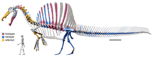 Spinosaurus is a genus of spinosaurid dinosaur that lived in what now is North Africa during the Cenomanian to upper Turonian stages of the Late Cretaceous period, about 99 to 93.5 million years ago.The genus was known first from Egyptian remains discovered in 1912 and described by German palaeontologist Ernst Stromer in 1915. The original remains were destroyed in World War II, but additional material came to light in the early 21st century. It is unclear whether one or two species are represented in the fossils reported in the scientific literature. The best known species is S. aegyptiacus from Egypt, although a potential second species, S. maroccanus, has been recovered from Morocco. The contemporary spinosaurid genus Sigilmassasaurus has also been synonymized by some authors with S. aegyptiacus, though other researchers propose it to be a distinct taxon. Another possible junior synonym is Oxalaia from the Alcântara Formation in Brazil.