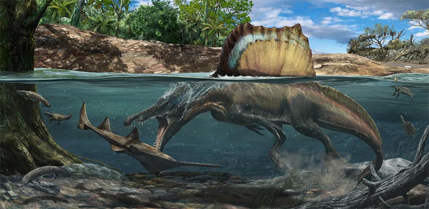 Spinosaurus is known to have eaten fish, and most scientists believe that it hunted both terrestrial and aquatic prey. Evidence suggests that it was highly semiaquatic, and lived both on land and in water much like modern crocodilians do. Spinosaurus's leg bones had osteosclerosis, allowing for better buoyancy control, and the paddle-like tail was likely used for underwater propulsion. Multiple functions have been put forward for the dorsal sail, including thermoregulation and display; either to intimidate rivals or attract mates. It lived in a humid environment of tidal flats and mangrove forests alongside many other dinosaurs, as well as fish, crocodylomorphs, lizards, turtles, pterosaurs, and plesiosaurs.