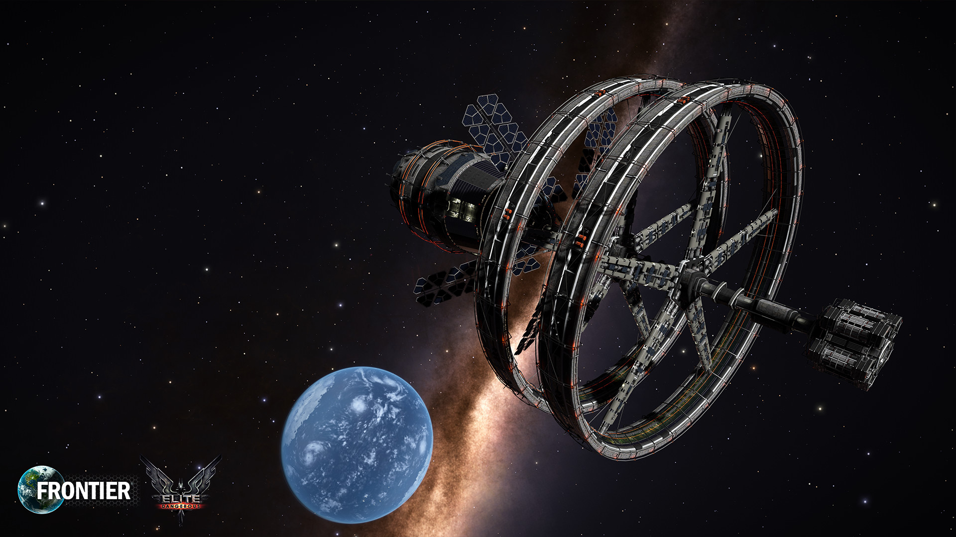 A Coriolis class station orbiting a water world. Planets can be mapped for extra credits and fame (If you find a very, very valuable planet)