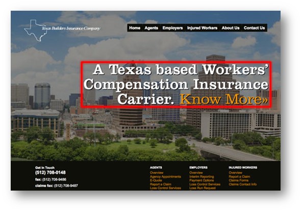 In this example of www.tbic.com, you see how there is a very large amount of “white space” (low proximity) around the major service offering, “A Texas based Workers Compensation Insurance Carrier.” While there is an image in the background, the lack of other visually complicated items has been purposely eliminated to create a strong compelling urge to read the sentence and act on the “Know More”. This is a great example of proximity (or lack thereof).