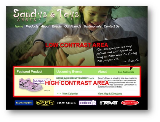 Contrast is defined as “the difference in visual properties that makes an object distinguishable from other objects and the background” (source: wiki : https://en.wikipedia.org/wiki/Contrast_%28vision%29). We like to say it means to make some things stand out more than others. A website needs to have some variation and contrast.
